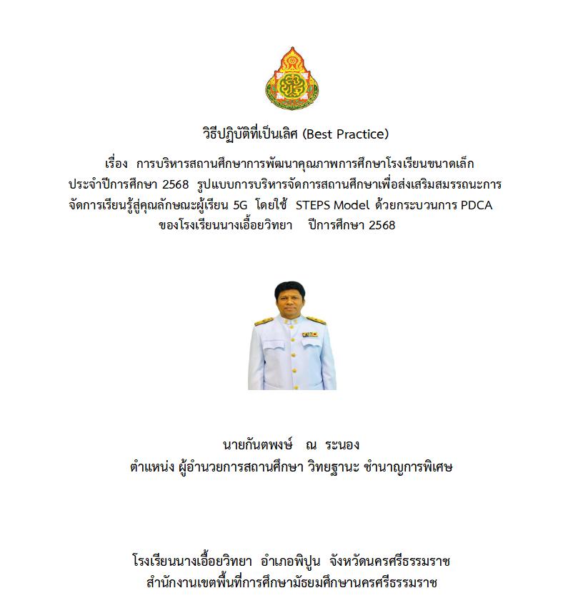 การบริหารสถานศึกษาการพัฒนาคุณภาพการศึกษาโรงเรียนขนาดเล็ก ประจำปีการศึกษา 2568 รูปแบบการบริหารจัดการสถานศึกษาเพื่อส่งเสริมสมรรถนะการจัดการเรียนรู้สู่คุณลักษณะผู้เรียน 5G โดยใช้ STEPS Model ด้วยกระบวนการ PDCA ของโรงเรียนนางเอื้อยวิทยา ปีการศึกษา 2568 |