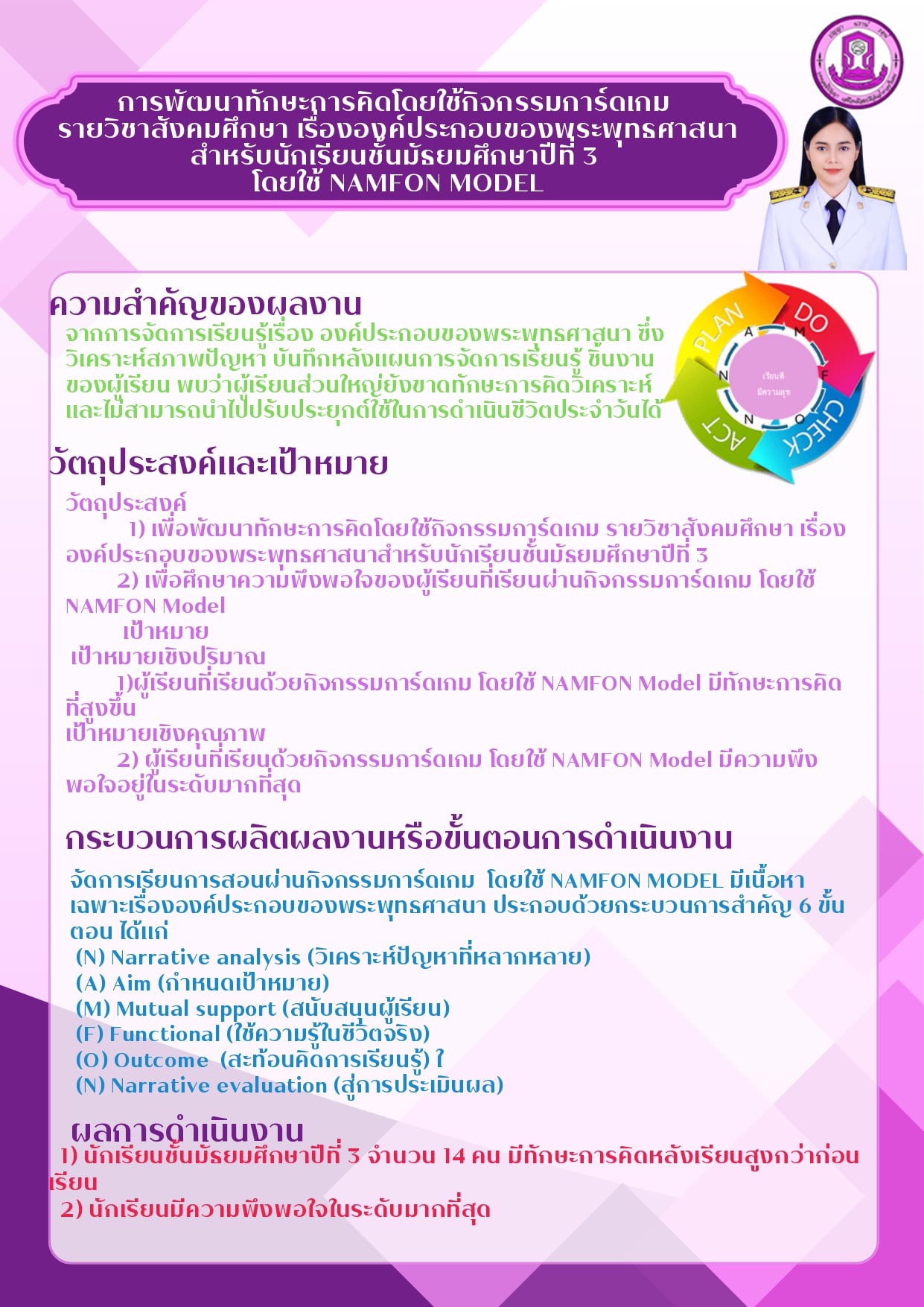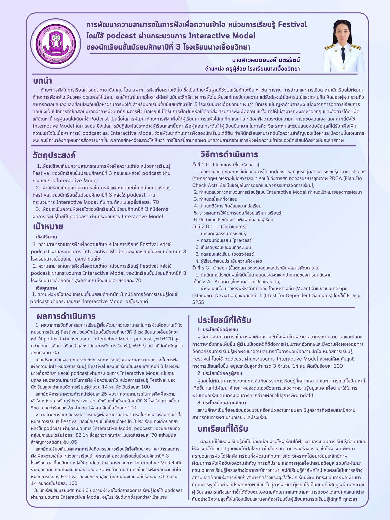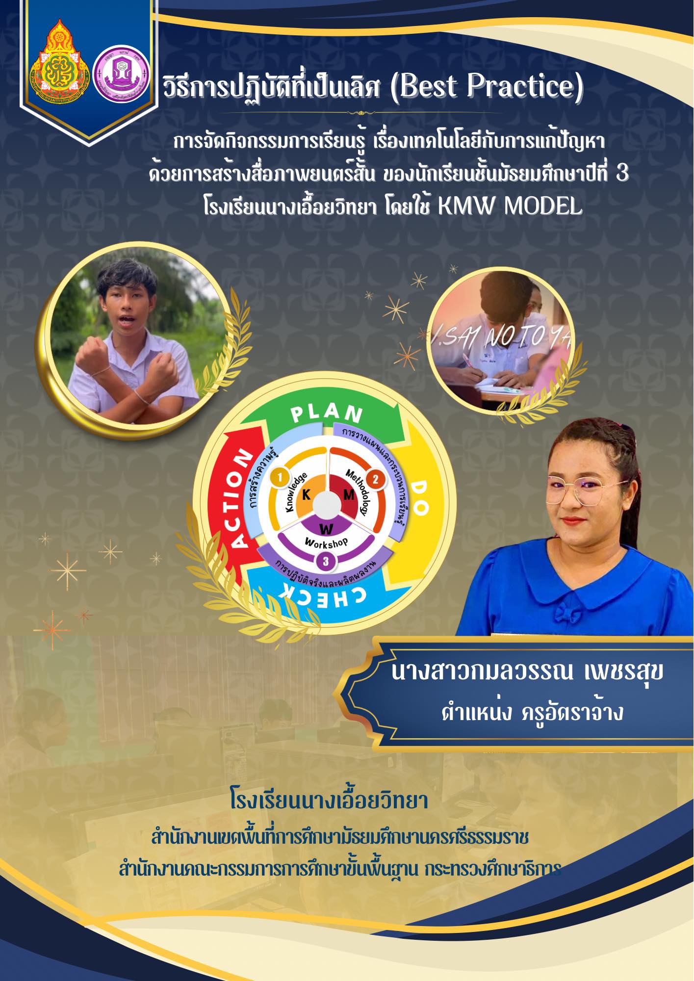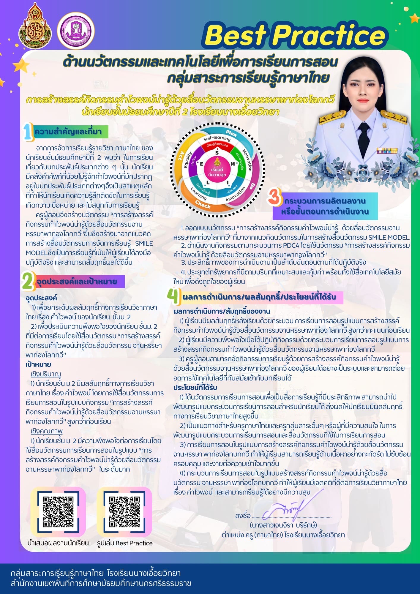 ผลการปฏิบัติงานที่เป็นเลิศ (Best Practice) เรื่อง การสร้างสรรค์กิจกรรมคำไวพจน์น่ารู้ด้วยสื่อนวัตกรรมจานหรรษาพาท่องโลกกวี นักเรียนชั้นมัธยมศึกษาปีที่ 2 โรงเรียนนางเอื้อยวิทยา |